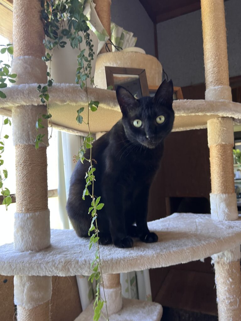 Tシャツに描いてくれた黒猫は、私の愛猫ピーコ(女の子)です。